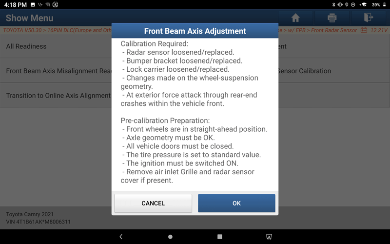 14. Show a list of special features, and choose "Front Beam Axis Adjustment".